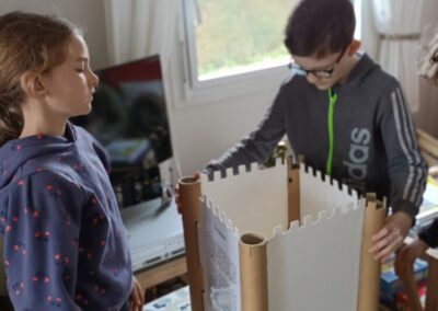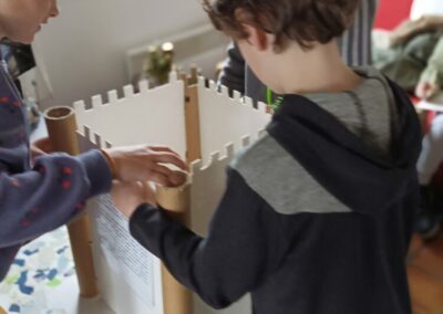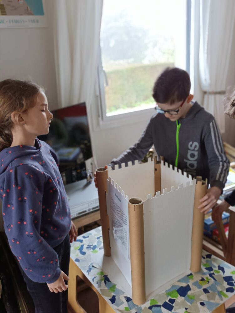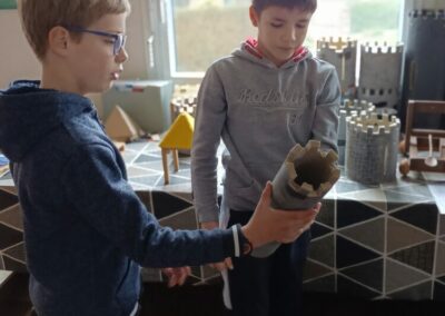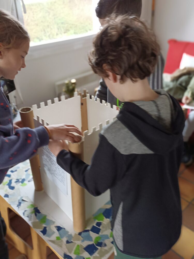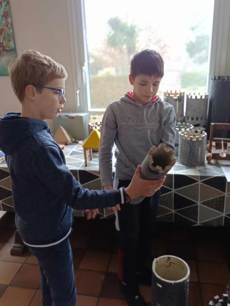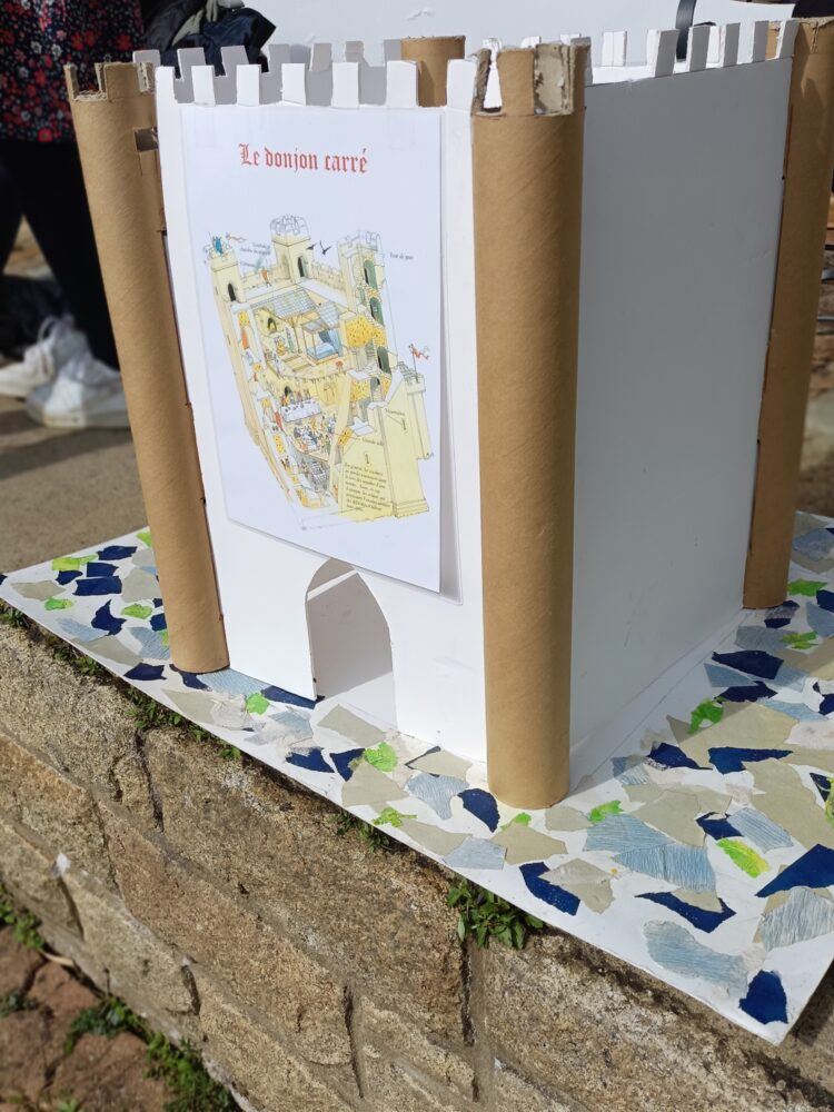 Les CE2 et CM1 ont eu à reconstituer plusieurs maquettes de différents types de châteaux du Moyen Age : du château à motte en passant par la Tour Carrée et enfin le château fort XXL avec ses murailles, ses nombreuses tours, son pont-levis et ses douves.